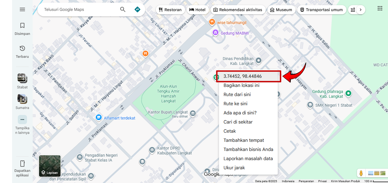 - Pilih atau klik bagian koordinat (angka lintang dan bujur) yang muncul pada menu.